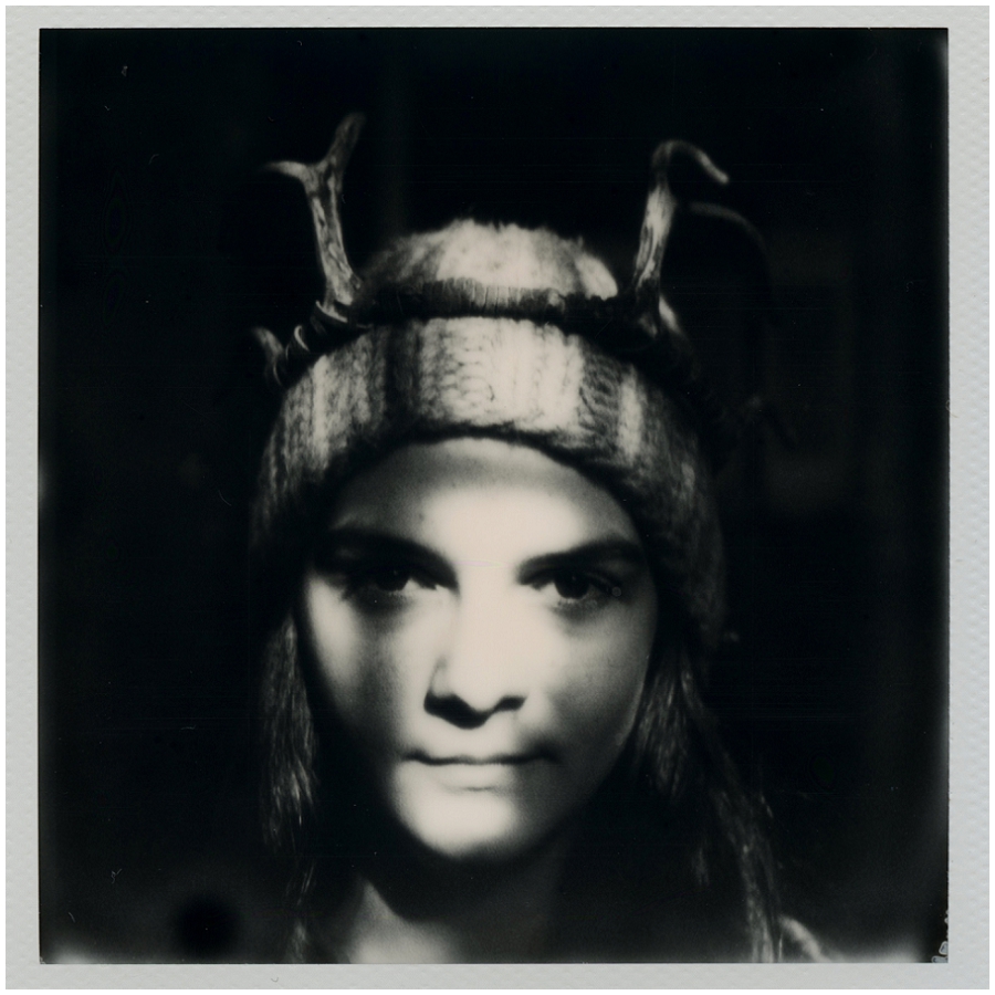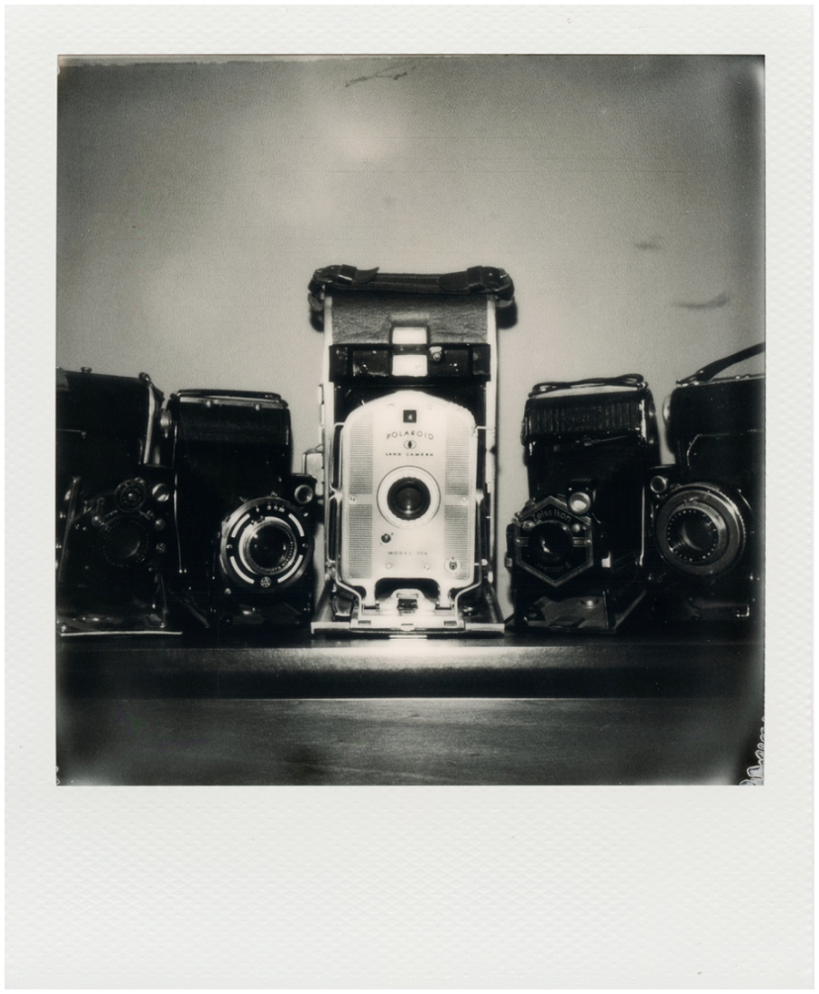 I tried using a flash pack with these black and white images of Meadow with her antlers inside, both in and out of a little patch of sunshine. They are cropped square, but were shot with the same format film as the color. The image of the cameras on the shelf also were made using flash cubes.